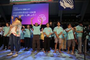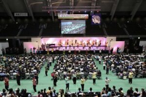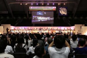 最後に、群馬から次回開催地・兵庫へとバトンが引き継がれ、全員で平和への願いを込めて『青い空は』を歌い閉会しました。