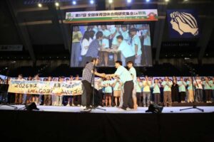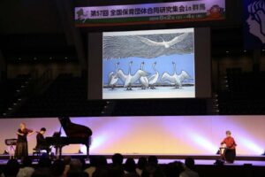 当日以降、録画配信に向けて「一緒に学ぼう・話しあおう」という呼びかけがさらに広がり、また参加者の学んだことを熱く報告する姿が保護者の心を打ち申し込みにつながる、勇気をもって先輩に働きかけ幼児担任で毎週話しあえるようにしたなど、各地で豊かな保育・子育てを実現するための新たな一歩がふみ出されています。第58回合研は兵庫県での開催です。群馬合研での学びや熱い思いをそれぞれ園・地域で広げ、実践を重ねて持ちより、誘いあって兵庫で会いましょう!